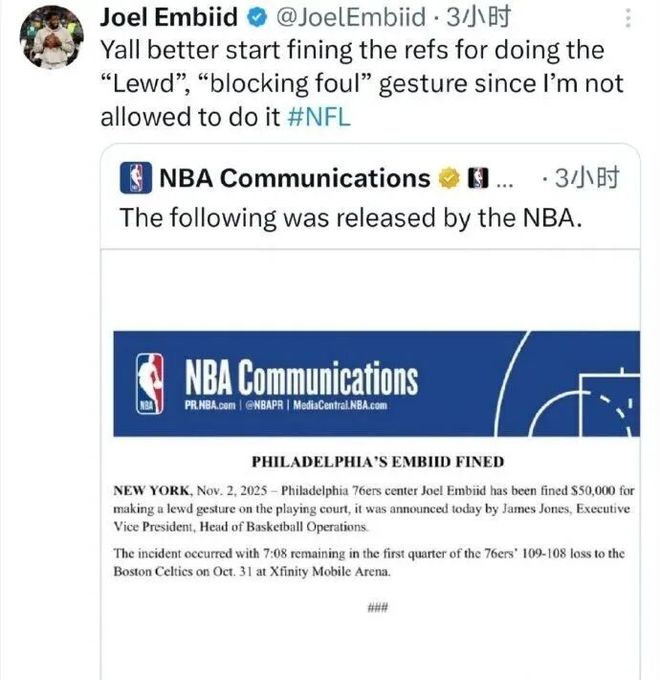 恩比德:若我不被允许做“猥亵”的“阻挡犯规”手势,那裁判也受罚吧